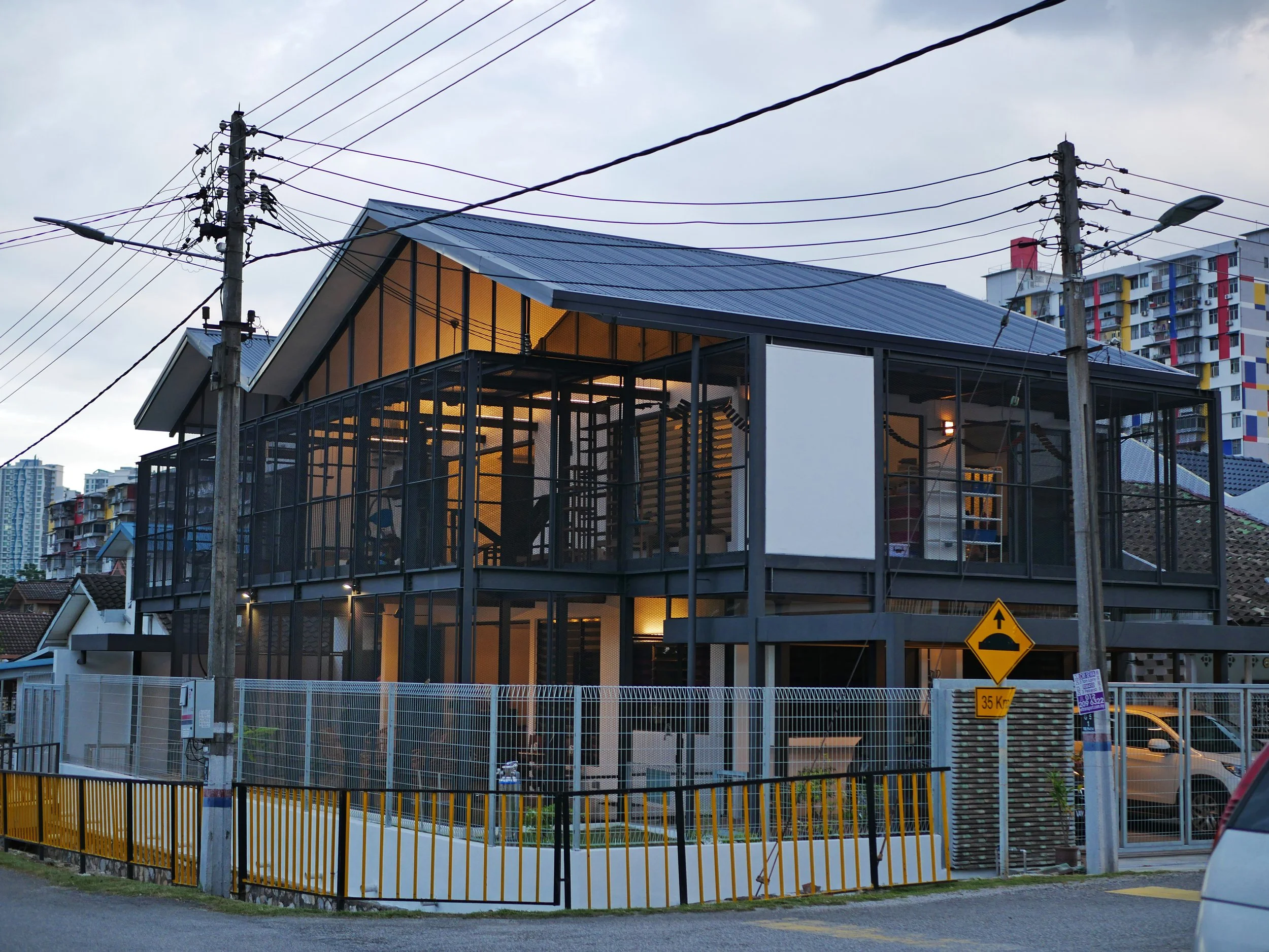 Within the nostalgic enclave of Salak South, this corner terrace transforms a typical single-storey ‘taman’ house into a compact, multi-species home. Designed for three humans, 18 cats, and 2 dogs, the house is extended upward with a lightweight steel structure. A central landscaped courtyard reorients the plan, improving light and cross ventilation while organising spaces to the perimeter. Living areas connect to a screened terrace, blending indoor and outdoor use. Upstairs mirrors the layout, with a studio and dedicated feline zones. Using a restrained palette of concrete, steel, brick, aluminium, and glass, the design prioritises durability, airflow, and ease of maintenance.