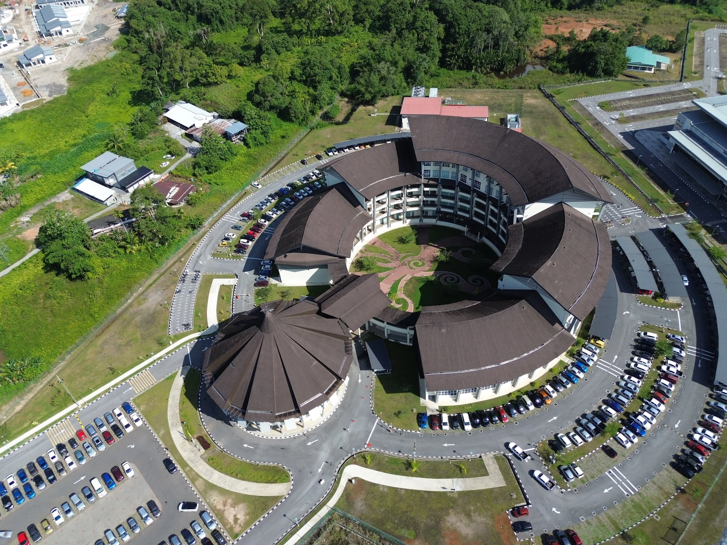 The proposed Serian Government Office Complex (GOC) serves as a centralised hub for key administrative departments within the newly established Serian Division. Inspired by the Bidayuh Longhouse and Baruk, the design reflects community, unity, and shared purpose. Multiple building blocks are arranged in a clustered layout, connected by curved corridors around a landscaped courtyard. At its heart, a Baruk-inspired structure functions as a social and civic focal point, housing a multi-purpose hall and exhibition space for public engagement.