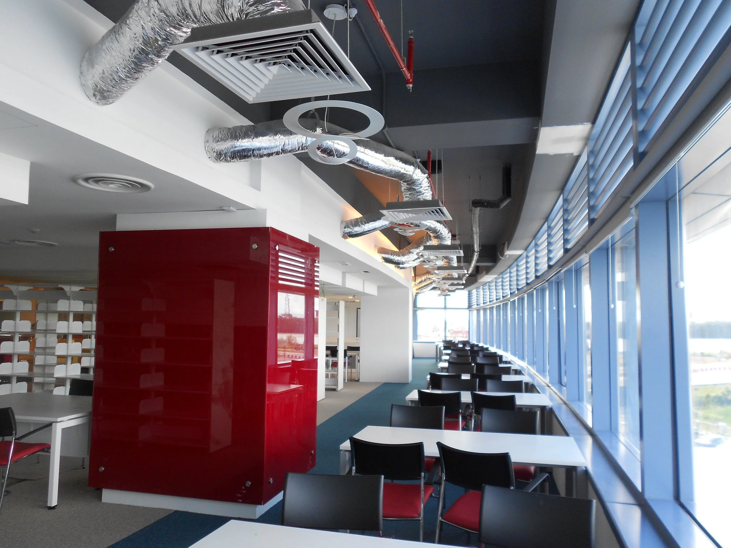 A high-volume central atrium which binds the office wings together serves as the natural energy conduit. This configuration comprises two glazed office wings (North and South) surrounding the atrium and are spanned between two "solid" cladded volumes on the East and West wings. A playful combination of ascending screens and roof scape provides a dramatic termination to the office building.