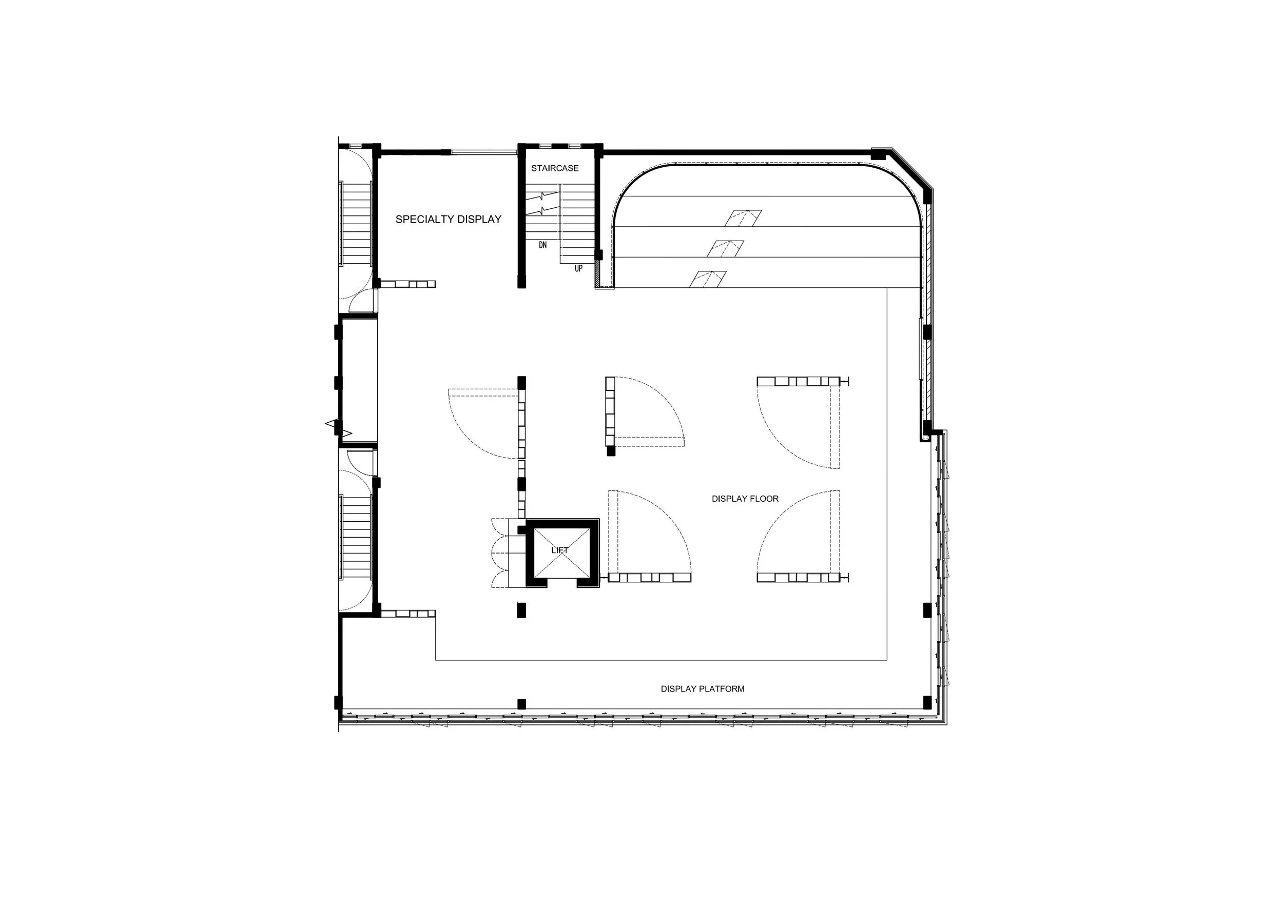 At ground level, the design extended the external walkway seamlessly into the showroom. A combination of terracotta tiles in varied shapes and tones, together with grey pebble wash, was used to form a continuous floor surface that visually and physically connects interior and exterior spaces. The external walkway walls were fitted with full-height glazing and steel fins, aligning with the rhythm of the floor patterns.