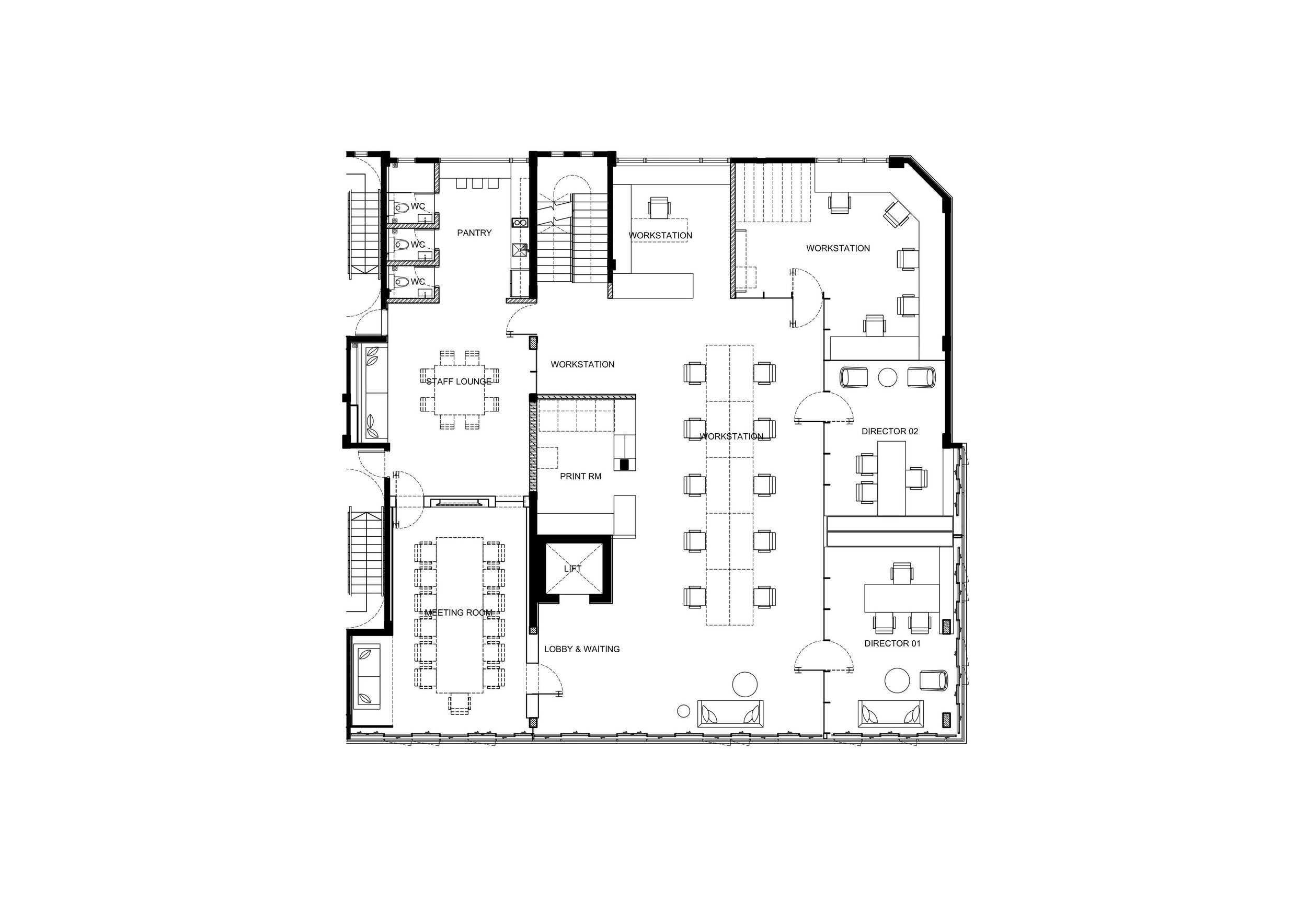 The second floor was planned as an open-plan office, with directors’ rooms enclosed in glass to allow daylight into the central workspace. A meeting room, finished in oxidised steel and timber laminate, was intended to be shared with the adjoining shop unit, which is also owned by the same proprietor who runs a construction business. Other areas, including the staff pantry and rest spaces, were similarly designed to maximise natural light and ventilation.