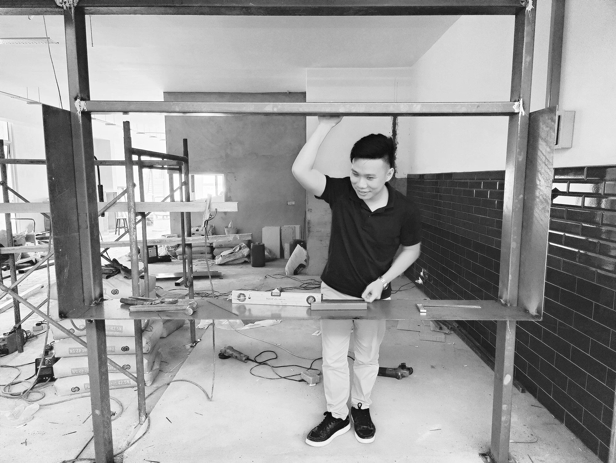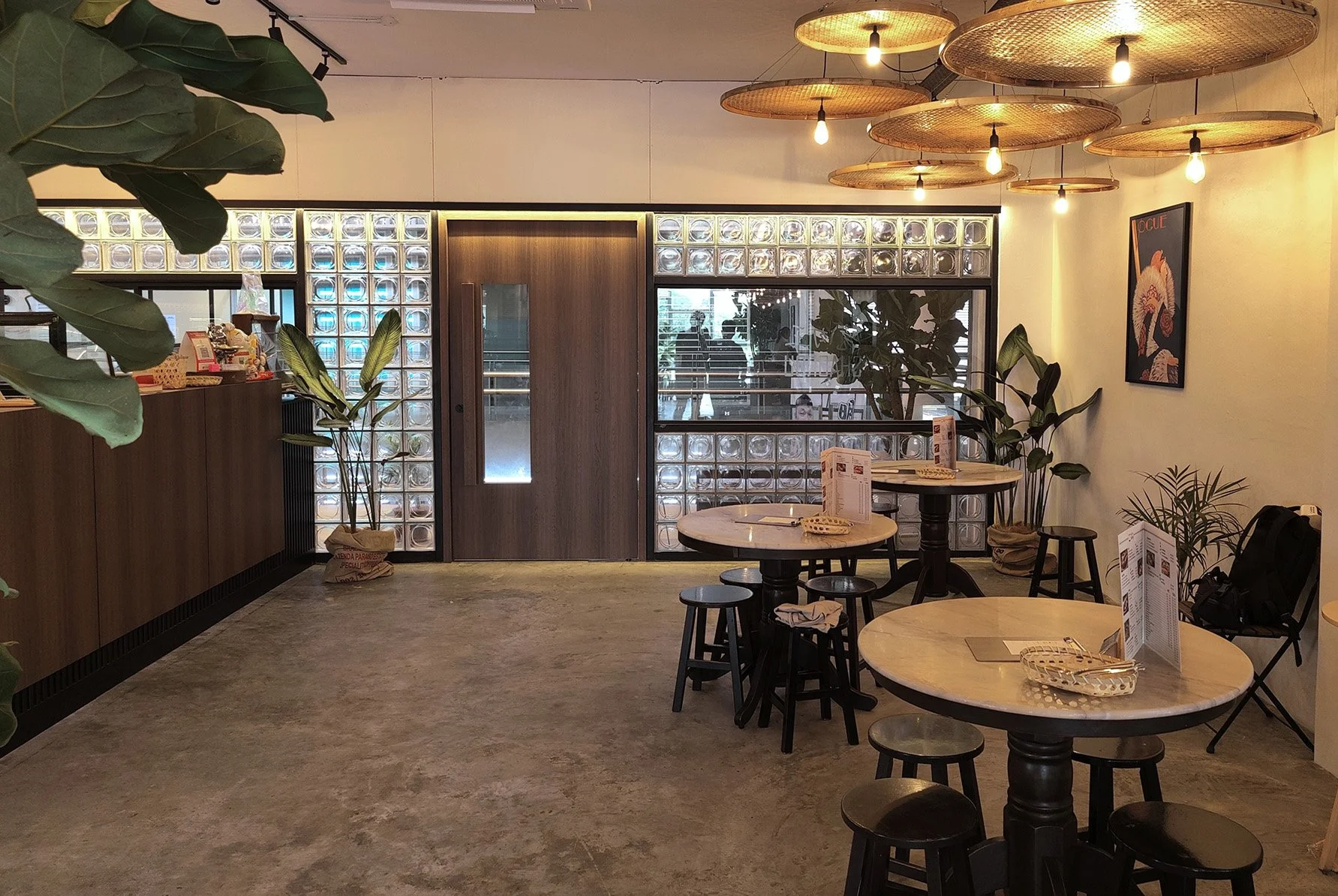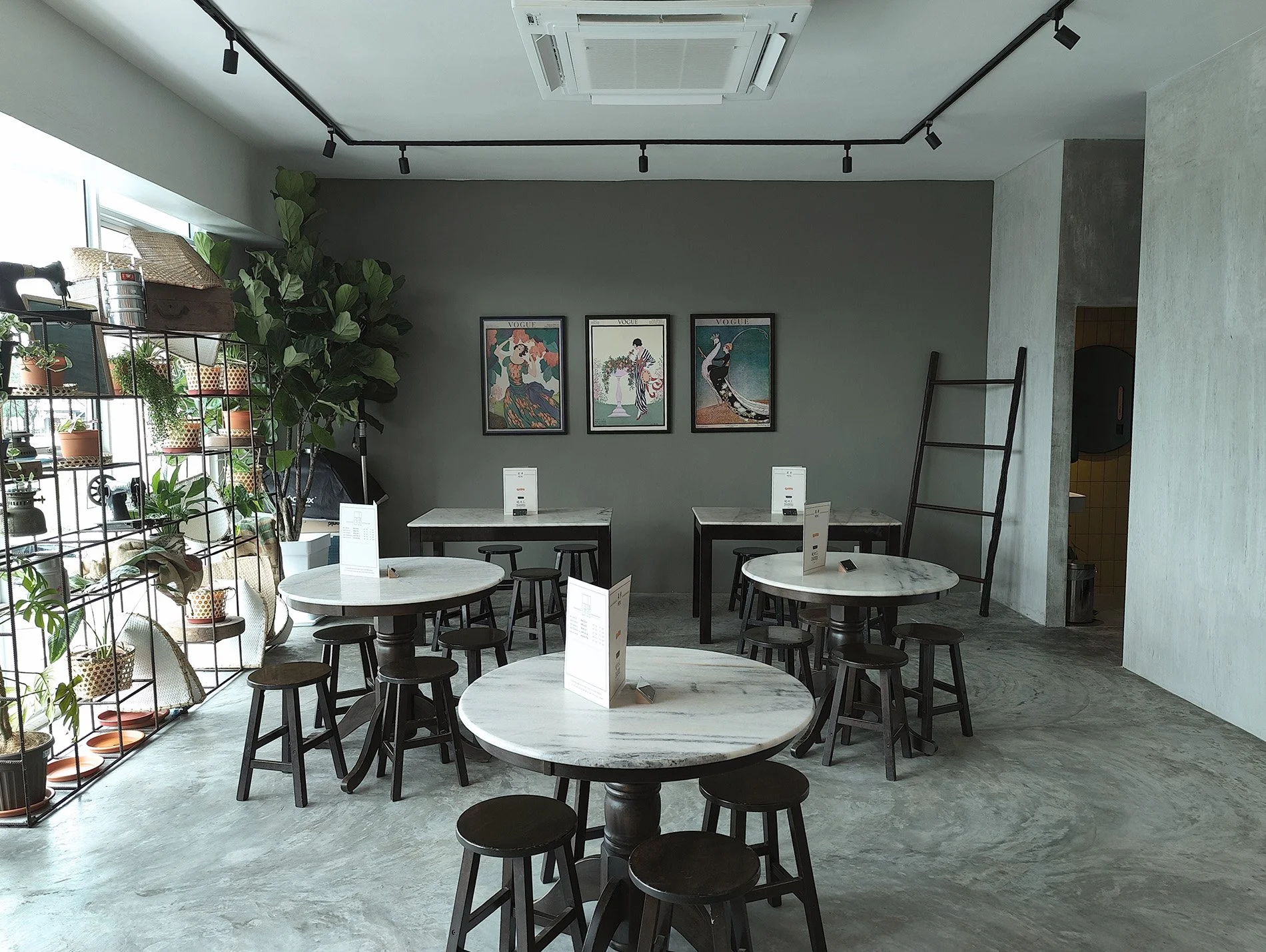 Indoor plants are used extensively in this project due to the generous amount of natural light provided by existing east-facing full-height windows. This approach also served to soften and add warmth to the café’s overall aesthetic, contrasting its ‘cooler’ material palette. To minimise cost, reconditioned furniture and decorations were used. Finishes were also expressed in their raw state wherever possible to keep in the same spirit of these reconditioned pieces and reduce cost.