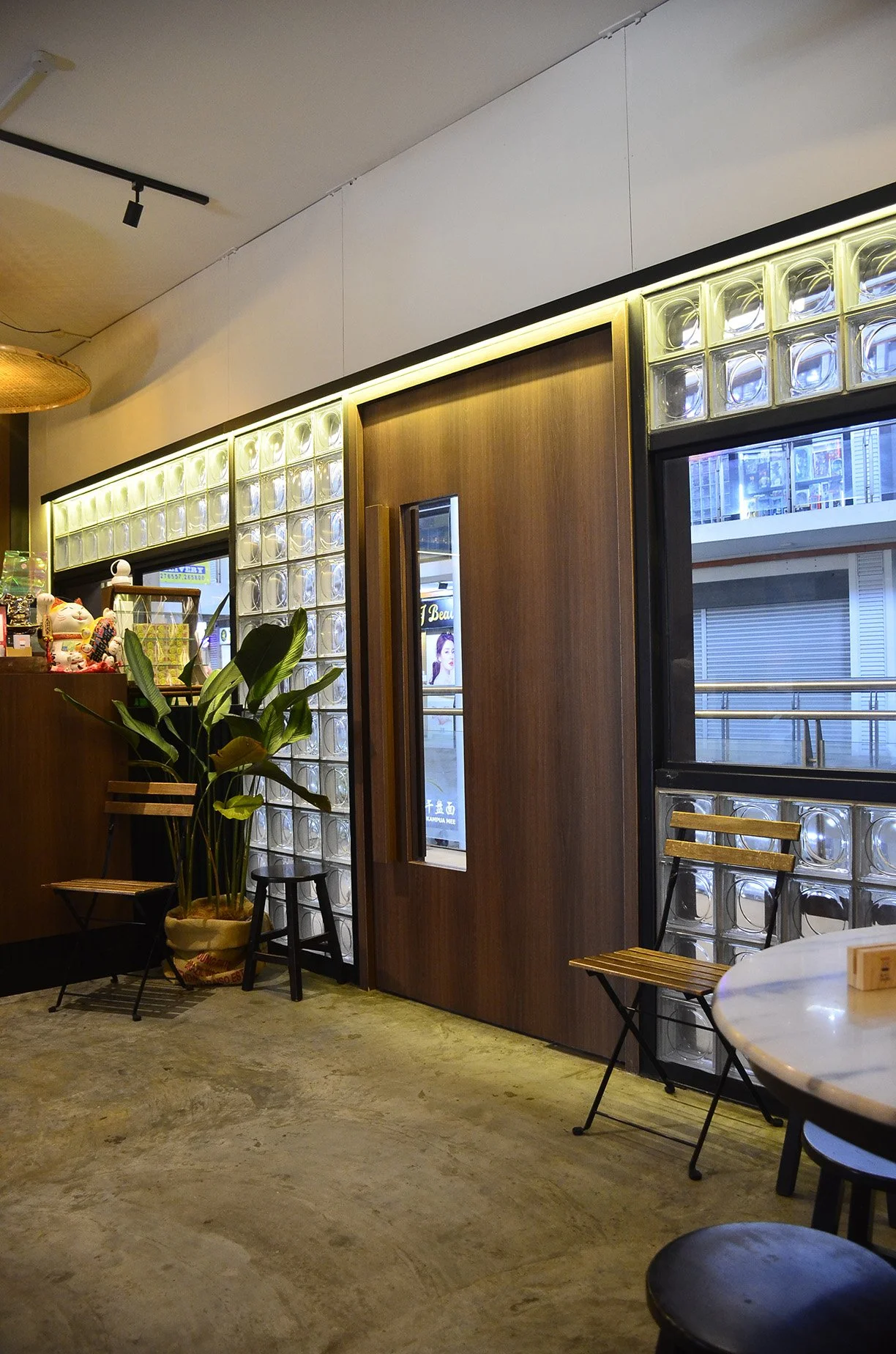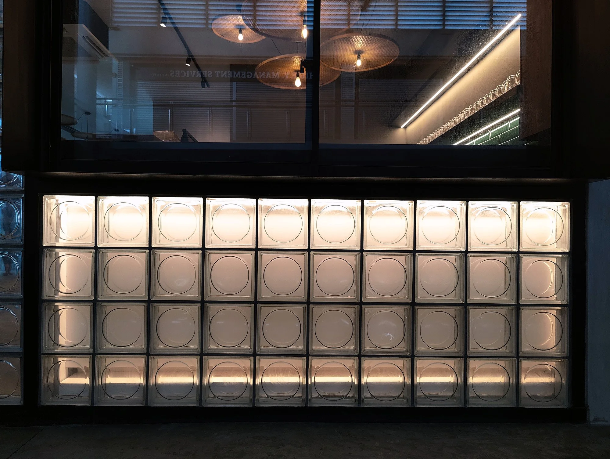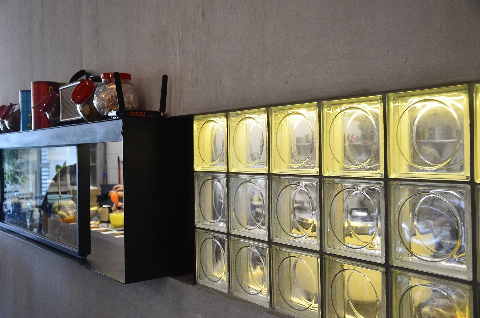 Glass blocks were incorporated extensively throughout the café. This is due to their ability to balance transparency and privacy, ease of maintenance, and air-conditioning requirements. The design of the glass block façade of the front intends to strike a balance between the idea of pulling in crowds through transparency, while maintaining enough detachment from the busy coffee shop environment outside.