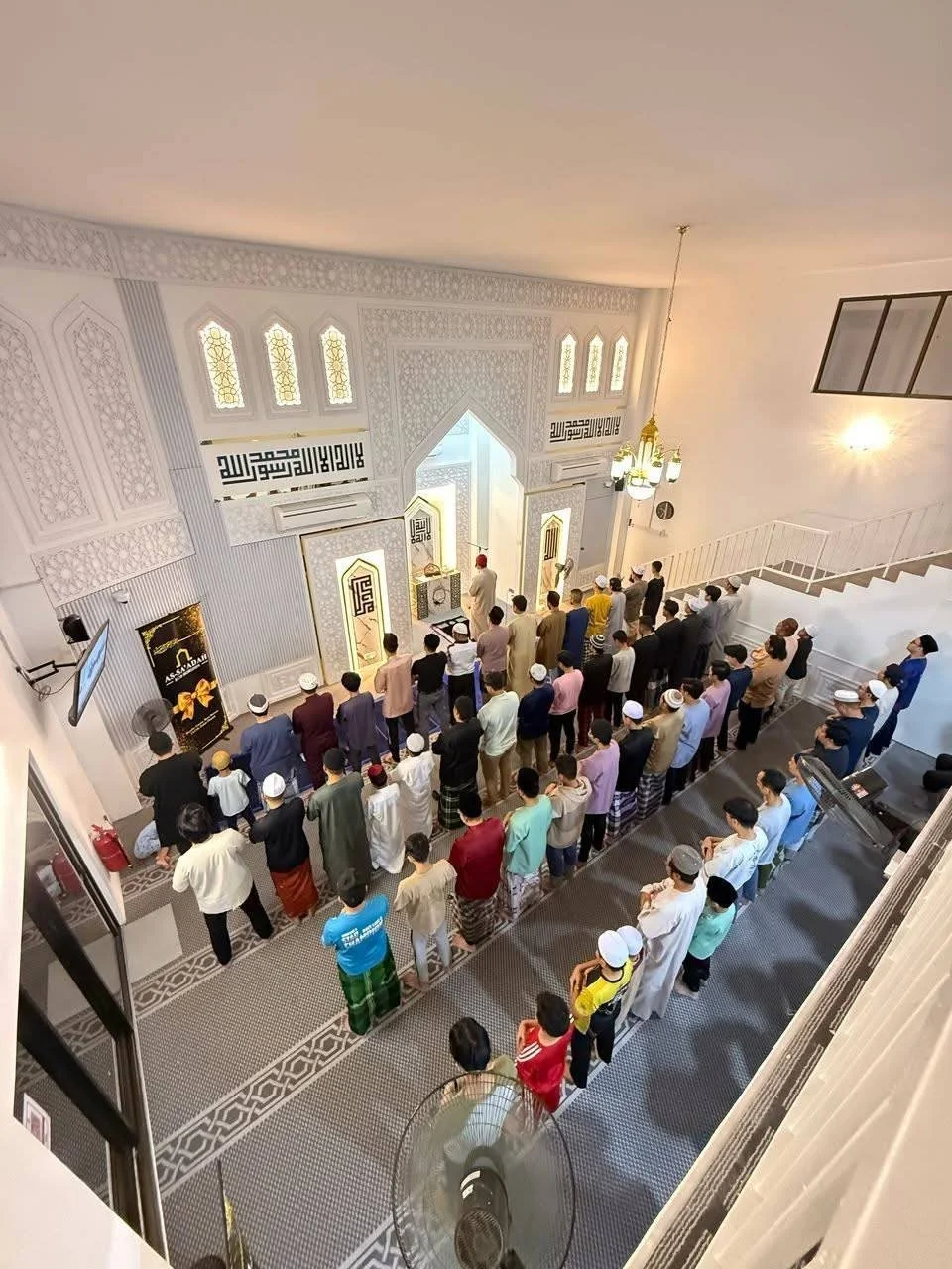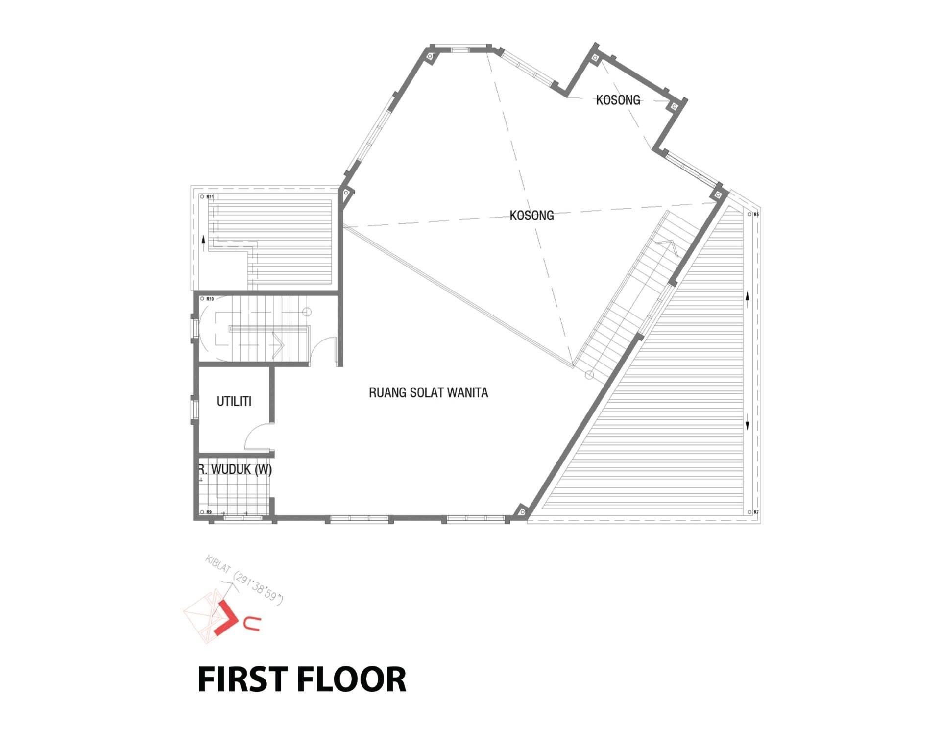The structure consists of two floors and encompasses a total area of 2,871.40 square feet. On the ground floor level, the main prayer hall is oriented towards the Qibla direction, maximizing the practical space. An additional space, referred as 'Ruang Limpah' can be created by opening the sliding doors, thereby allowing for an increased capacity of individuals to assemble and perform prayers.