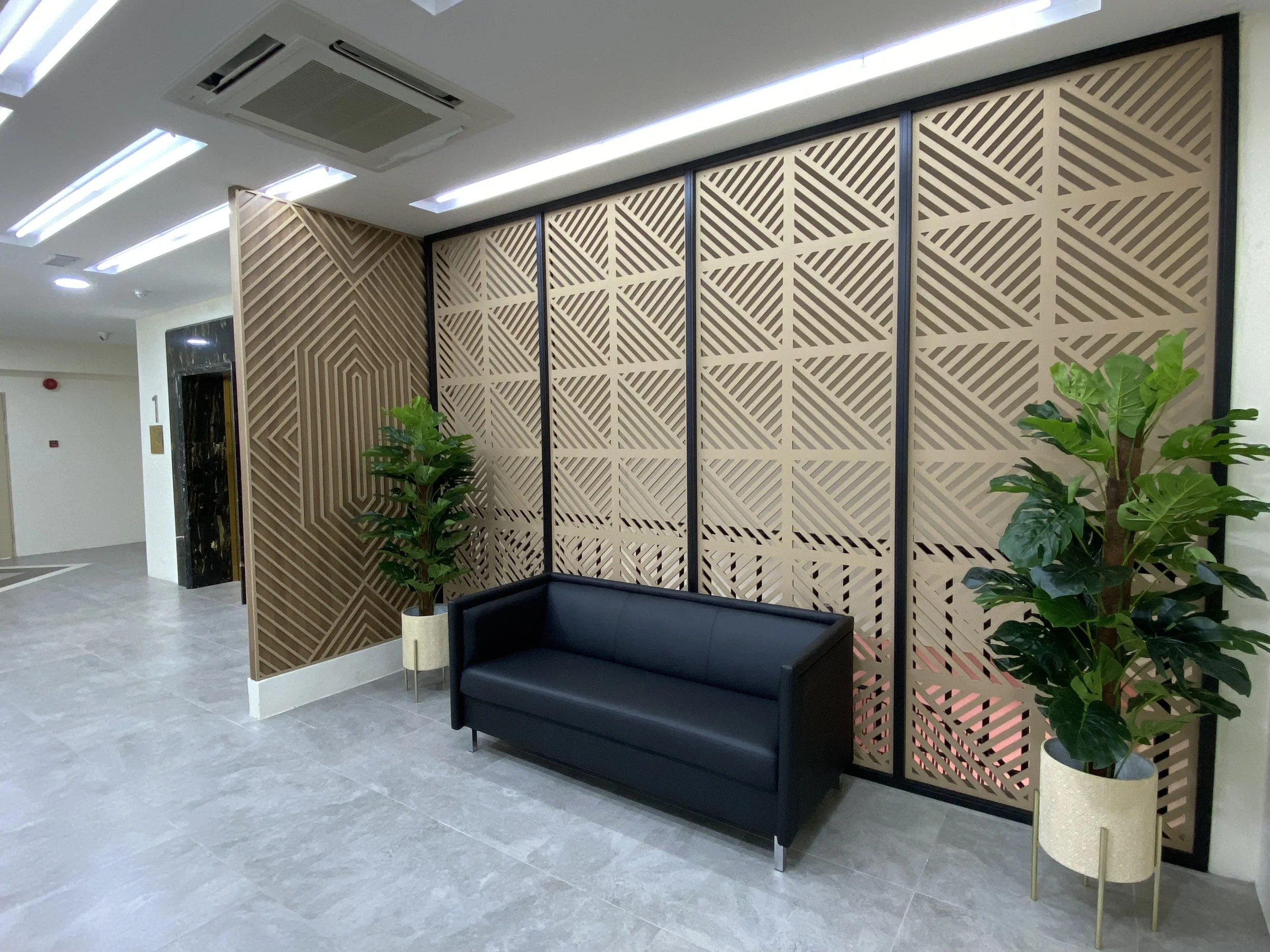 The interior design reinforces the project’s conceptual intent through a restrained palette and culturally informed detailing. Neutral surfaces form the primary backdrop, enriched by timber finishes, geometric patterns, and indigenous motifs integrated into ceilings, screens, feature walls, and joinery. SABATI’s signature colors — pink, peach, and purple, are selectively applied to key spaces, subtly reinforcing organisational identity without compromising spatial clarity. The use of local materials and craft-inspired detailing contributes to a sense of authenticity and place, while maintaining a contemporary, professional environment conducive to both productivity and public engagement.